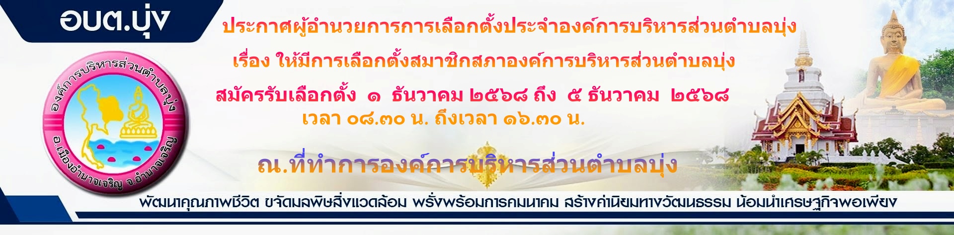 องค์การบริหารส่วนตำบลบุ่ง หมู่ 4 ถนน บ้านแสนสวาสดิ์-บ้านเจริญสามัคคี ต.บุ่ง อ.เมืองอำนาจเจริญ จ.อำนาจเจริญ 37000 โทรศัพท์ 045-451686 โทรสาร 045-451686 ขับเคลื่อนโดย THAI.AC เข้าระบบ