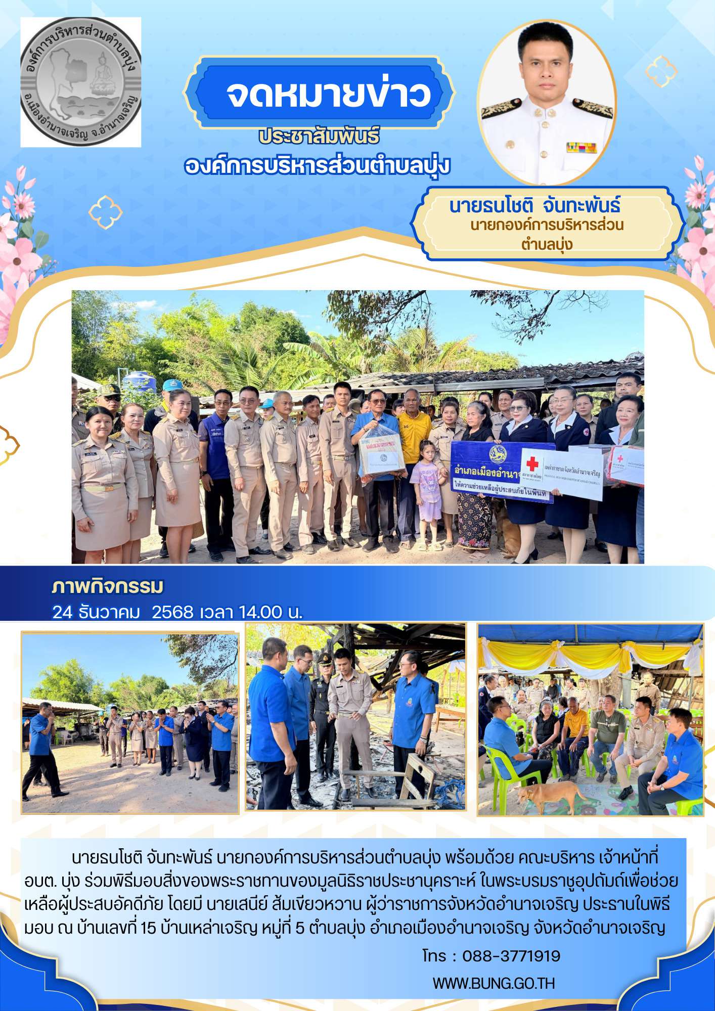 หน้าหลัก ประวัติตำบลบุ่ง สภาพทั่วไป วิสัยทัศน์ ตราสัญลักษณ์ ที่ตั้ง/แผนผัง ข้อมูลหมู่บ้าน โครงสร้างการบริหารงาน อำนาจหน้าที่